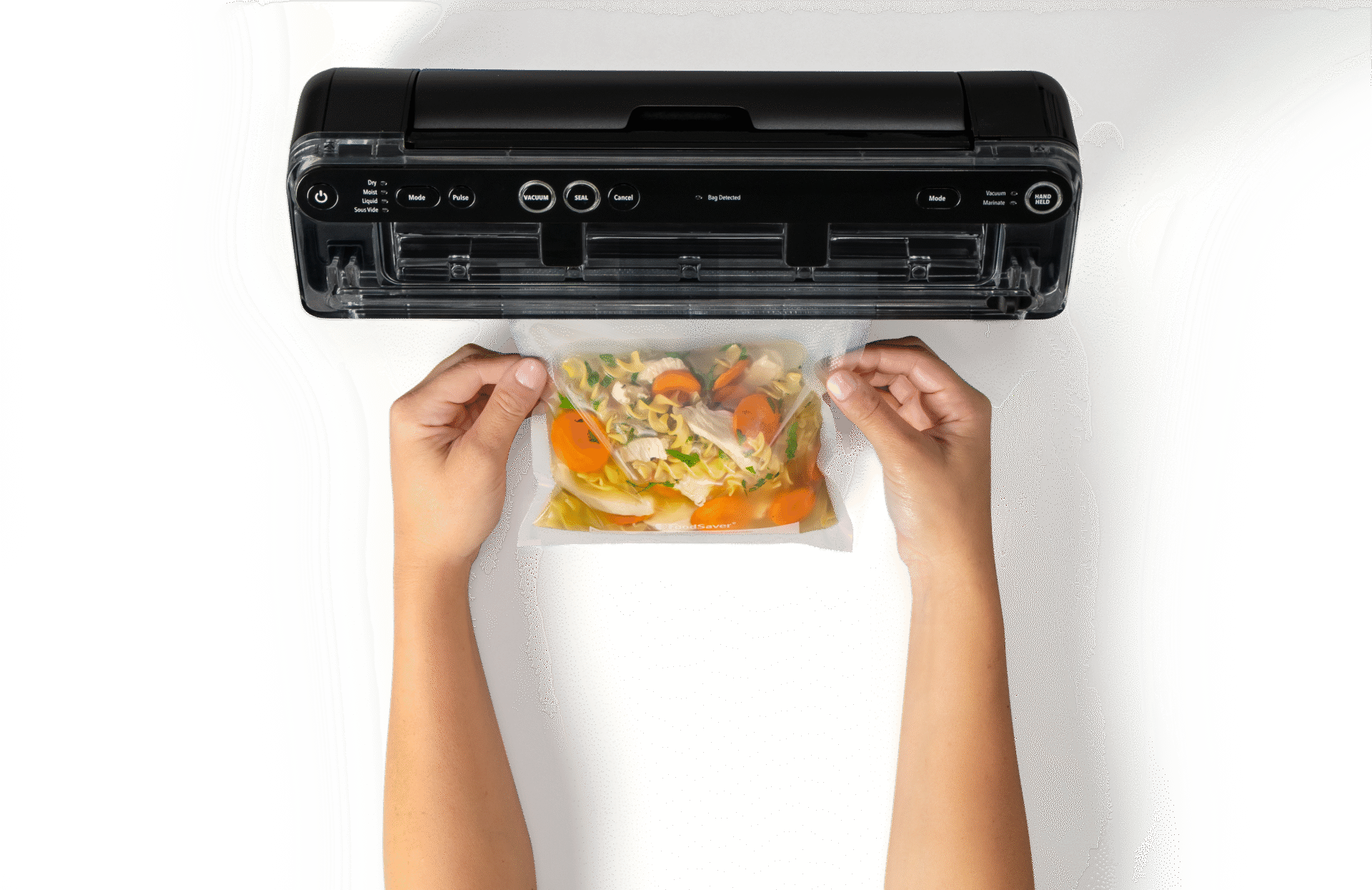 - Inbyggd, utdragbar handhållen vakuumpackare för zipp-påsar och matlådor.