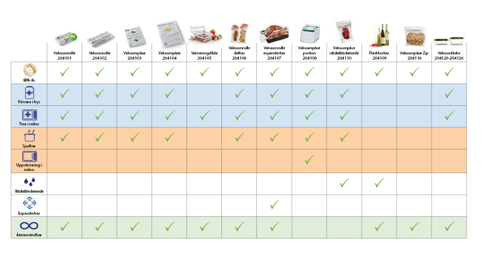 I matrisen ovan hittar du några av de vanligaste tillbehören som du kan använda tillsammans med FoodSaver vakuumpackare. Vilka tillbehör passar dig bäst?